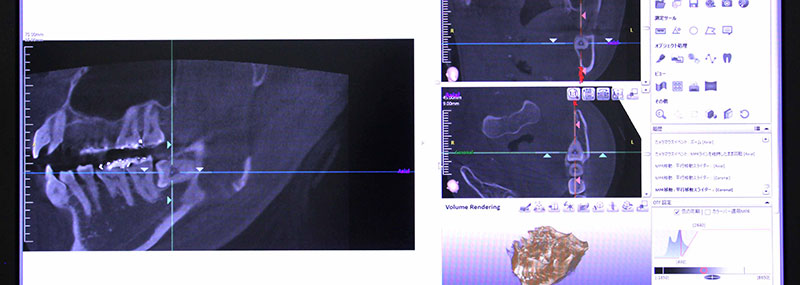 当院では、安全性と正確性が求められる歯科治療の診断にアールエフのNAOMI-CTを完備しています。 CTを使って、骨の状態、顎関節、歯根の膿、親知らず、神経の走行など、お口に関わる様々な診断が可能です。 NAOMI-CTのエックス線被爆量は0.1msv(医科用CTの1/30)です。 パノラマやデンタル画像に加えて、3D画像を取り入れることで、口腔内を立体的に観察し、診断に重要な要素を把握することができます。