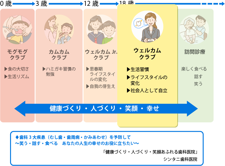 | Welcome Clubとは… | 成人を対象とし、歯周病予防を中心とした健康システムです。 かかりつけの歯科医院として個人の検査データを十分に把握し1人ひとりに合った専門的なアドバイスを行い、セルフケアを行いやすくし、健康へのサポートを目的としています。 |