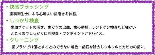 | ①口腔内視診 ②歯周ポケット測定 ③赤染(※1) ④快感ブラッシング ⑤歯石の除去 ⑥PMTC(※2) |
